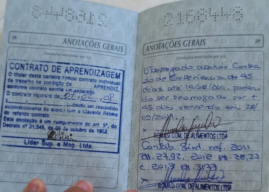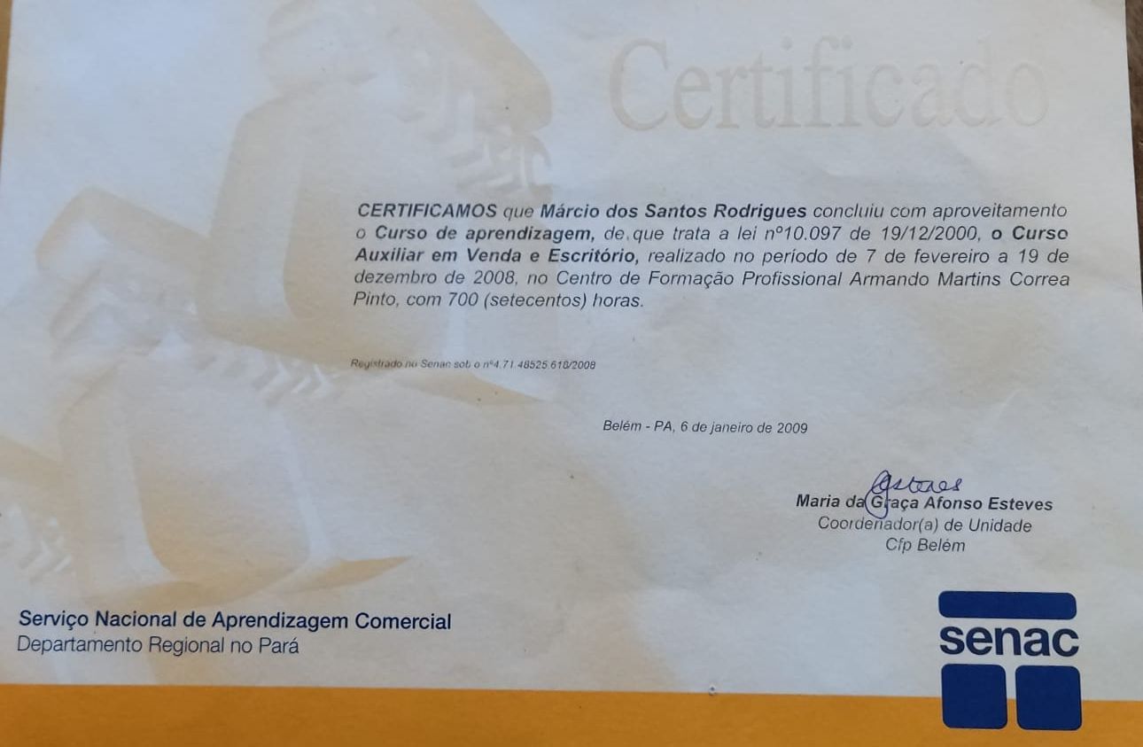 Marcinho começou a trabalhar aos 17 anos, no programa de jovem aprendiz do SENAC-Pará, recebeu carta de recomendação das Empresas do Grupo Líder, onde iniciou sua carreira. Abaixo estão as provas que constam a carteira de trabalho assinada, diploma de conclusão de curso de Aprendizagem e carta de recomendação.